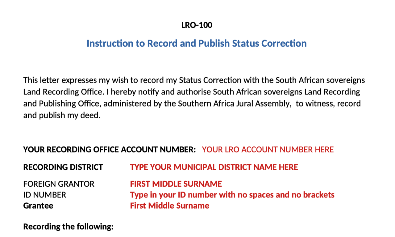 Declare your intention to record your status correction, emancipation, with the recording office, and to create a public record at common law in land jurisdiction.